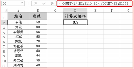 ④ 将步骤③返回值(大于等于60分的记录条数)除以B2:B11单元格区域中的数字个数(总记录条数),即可计算出及格率。
