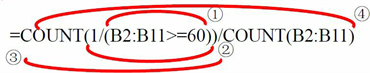=COUNT(1/(B2:B11>=60))/COUNT(B2:B11)