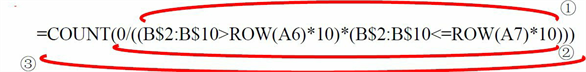 =COUNT(0/((B$2:B$10>ROW(A6)*10)*(B$2:B$10<=ROW(A7)*10)))
