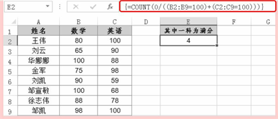 按“Shift+Ctrl+Enter”组合键,即可统计出一科为满分的人数,如图4所示。
