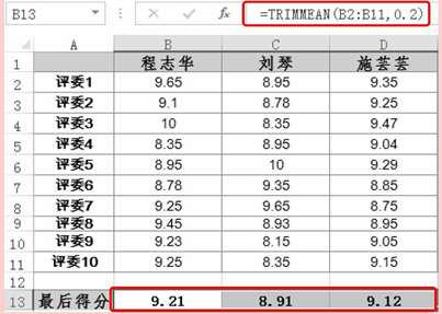 ➋ 选中B13单元格,向右复制公式,即可计算出其他选手的最后得分,如图1所示。