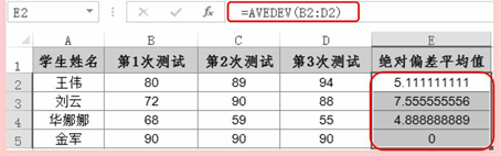 通过对学生成绩进行3次测试后,这组数据与其均值的绝对偏差 的平均值,可以使用AVEDEV函数来实现。