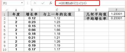 按“Enter”键即可得到几何平均值,在F2单元格设置公式为“F1-1”即可得到其平均增长率,如图1所示。