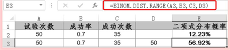 例如,要求计算当成功概率为70%时,在50次试验之中出现35~50次成功(包含)的概率。