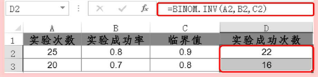 BINOM.INV函数表示返回使累积二项式分布大于等于临界值的最小值。