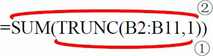 ①使用TRUNC函数对B2:B11单元格区域中的数值进行取整,并将结果保留一位小数。