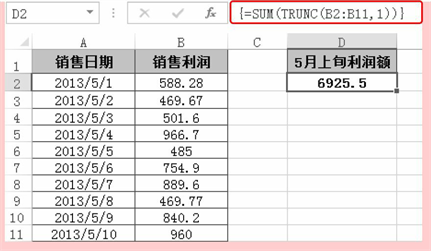 按“Shift+Ctrl+Enter”组合键即可以1位小数形式返回5月上旬的利润总额,如图6所示。