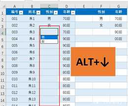 下面再介绍一下下拉列表,从图中可见C列已经输入了两个数据,即男、女两个单元格内容,我们点击C列下方的任意单元格,按下快捷键ALT+↓,会自动出现一个下拉列表。