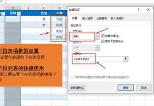 最佳答案一、下拉选项框的制作在下图中,需要在D列设置年龄段的下拉选项框。首先选择需要进行设置选项框的单元格区域,这里即是D列年龄,随后点击数据工具栏,在功能区找到“数据验证”,点击它的下拉菜单,并选择“数据验证”。进入数据验证的设置界面,需要在“验证条件”框内选择“序列”。在下方“来源”中直接拖取作为辅助列......