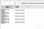 按照上个步骤设置分组依据后,聚合统计的结果如图所示。选择【最小值】和【最大值】两个字段,在功能区菜单切换到【添加列】选项卡,然后点击【合并列】进行两列的合并操作。