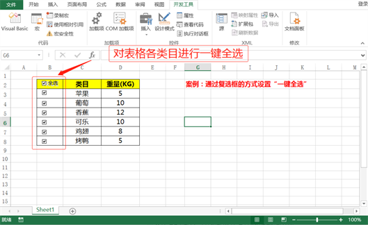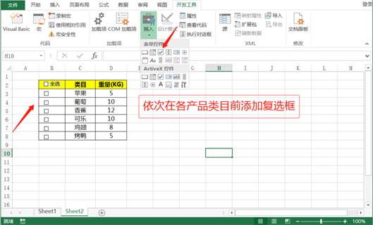第1步:勾选的方式是通过插件控件的方式实现的。所有首先我们需要依次在个产品类目之前的单元格中,点击菜单栏:开发工具—插入,选中复选框进行插入,我们将控件名称给删除掉,留下勾选框即可,这样就把勾选的标记添加到了项目之前。如下图所示: