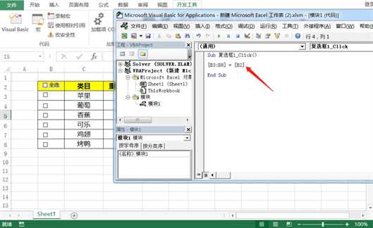 第2步:单个选项中添加完勾选控件之后,我们开始设置全选控件的功能。我们先选择全选的复选框,右键选择指定宏,点击新建,然后在代码窗口中间部分输入一段代码。[B3:B8]=[B2],这样就实现了当勾选B2单元格的控件后,B3:B8单元格的控件都能被选中。如下图所示: