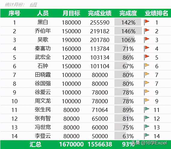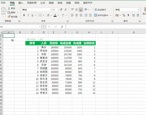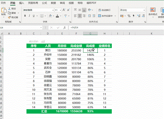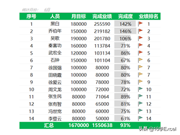 分别为统计月份,完成业绩,完成度,业绩排名,汇总字段。