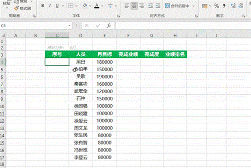 第二:将序号,完成业绩,完成度填上对应公式;