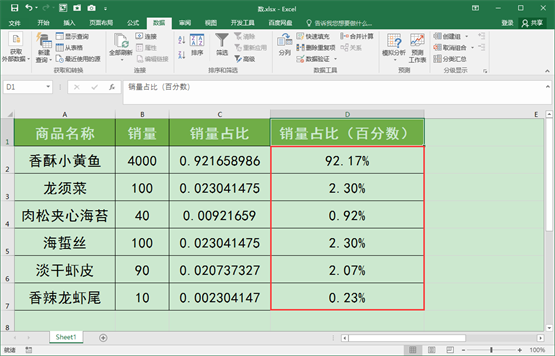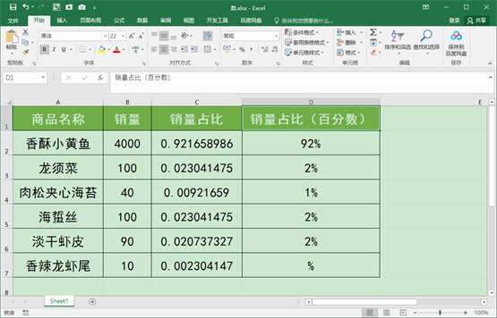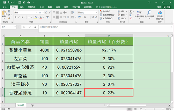 2.观察转化后的结果,可见最后一行“香辣龙虾尾”的销量占比(百分数)只显示出了一个百分号%。原因在于0.002304147四舍五入后等于0%,在应用公式TEXT(C2,”#%”)时,“0”是不显示的。