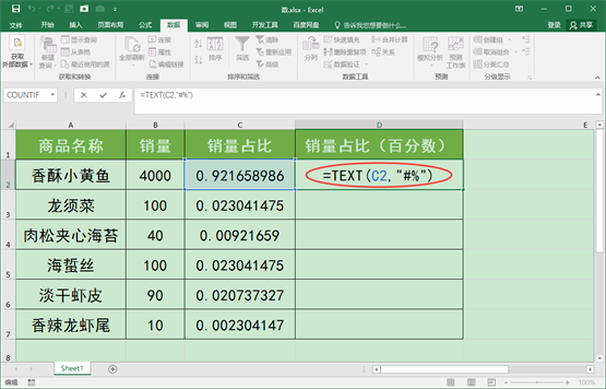 利用Text函数将下图C列中小数形式的“销量占比”转化为百分数,参见D列。