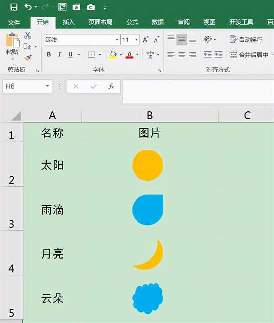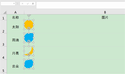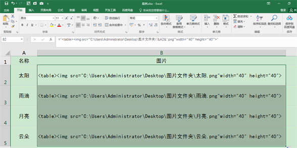 3.同时按Ctrl+A全选文本文档中的代码,再复制粘贴回Excel工作表的B2:B5单元格中,这时B2:B5单元格中就会显示出图片了,并且图片与同行A列中的名称会自动对应好。