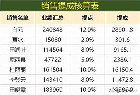 最佳答案示例:现在需要根据分区间提点的方案,求出每个销售员的提成。结果展示:销售业绩提成表销售提成核算流程:提成核算流程具体操作步骤如下:步骤一、分析提成方案(业绩区间不同提成点不同)例:本月业绩85000,对应销售提点6.5%,销售提成=85000*6.5%根据区间算核算提点步骤二、根据提成方案设置提点底......