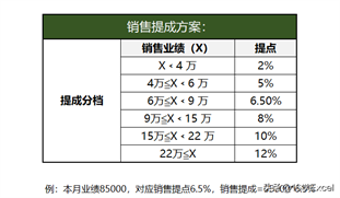 例:本月业绩85000,对应销售提点6.5%,销售提成=85000*6.5%