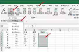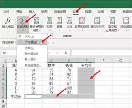 同理: 选中B8:E8区域,依次点击公式,自动求和,平均值