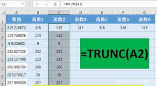 这个函数可能大家有点陌生,但它是用来截取数字指定位数的函数,在下图中公式=trunc(A2),省略了第二个参数,即表示不截取小数点后位数,即只截取整数,其结果与int函数是完全相同的。