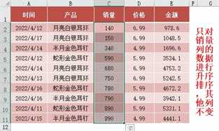 表格数据中,只有销量列的数据单独进行了排序,其他列的数据保持不变。