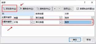 随后我们在设置框内点击“添加条件”,将次要关键字设置为”价格“,并将次序设置为“降序”。也就是以销量和价格作为排序条件,做降序排序。