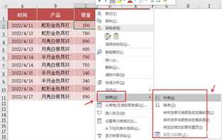 我们直接右击销量列下任意单元格,在弹出的菜单中点击”排序“,系统会显示出它的选项菜单,其中包括”升序、降序,自定义排序“等选项。