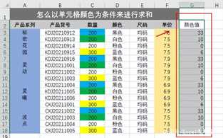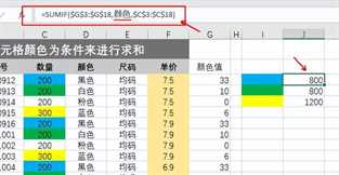 辅助列“颜色值”作为sumif函数的第1参数,即条件区域,然后定义名称“颜色”作为第2参数的条件,第3参数则是数据列C列的数量求和区域。