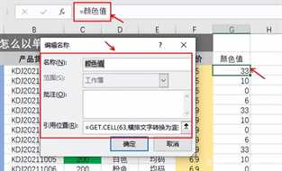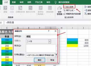 然后我们继续设置定义名称,再次设置一个名称为“颜色值”的宏表函数公式。
