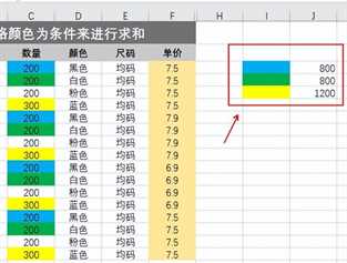 在表格中数量列包含了多种填充颜色,有蓝色、绿色和黄色,现在要计算各颜色的总数量,效果如下图: