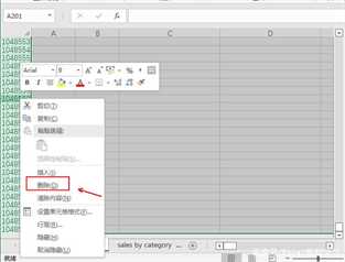 首先全选中200行后的所有单元格区域,右击鼠标,在弹出界面中点击“删除”。