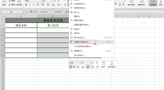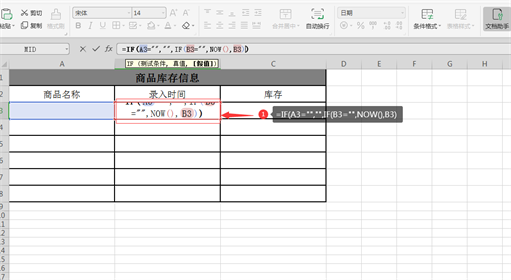 2、在录入时间空白单元格输入公式=IF(A3=””,””,IF(B3=””,NOW(),B3)