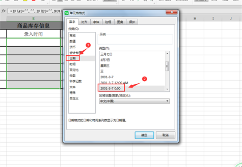 5、为录入时间设置单元格格式-日期-选择想要的时间格式,点击确认