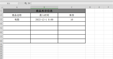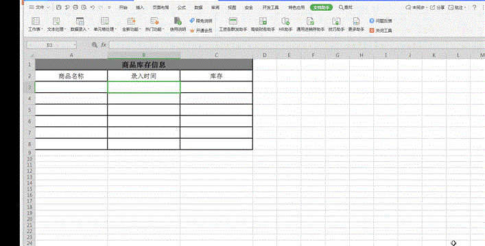 以下表商品库存信息表格为例,之前都是在录入商品名称后,手动录入时间。现在要实现的是在录入商品名称后,录入时间自动填写,删除商品名称后,录入时间自动删除。