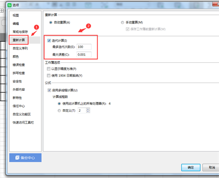 3、开启迭代计算的功能,笔者使用的wps,可以点击左上角文件-选项-重新计算-勾选迭代计算,点击确定。