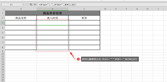 4、把库存录入时间往下复制足够多的行,就是其它行也使用=IF(A3=””,””,IF(B3=””,NOW(),B3)公式