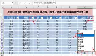 最佳答案一、超级表超级表的作用无需作者再重复阐述了,已经通过不同实例讲述过。我们直接进入正题,在下图中,已经对班级进行了筛选,现在需要对筛选后的高三1班,进行成绩水平为及格以上的人数统计。首先我们按下快捷键CTRL+T,快速创建一个超级表,并在”表设计“工具栏下,勾选“汇总行”,如下图所示:此时表格下方自动......