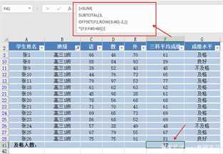 这里我们的目的是统计成绩及格的人数,即符合条件的计数,因此函数值参数选择3,而区域是一个公式:OFFSET(F2,ROW(3:40)-2,)