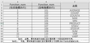 由1~11,101~111的数值来表示,每个数值都代表一个函数,而101~111的值会忽略隐藏的行,因此在计算有隐藏行的表格数据时,大家会使用subtotal来计算,而在筛选场景中,使用任何一种函数值形式,都会忽略不包括在筛选中的行数据。