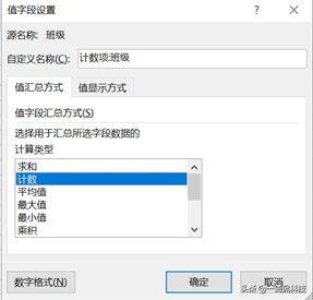 (2)双击左边的“求和项:班级”,在弹出的“值字段设置”中,将“计算类型”设为“计数”。如下图,单击【确定】,就完成了字段设置。