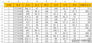 (1)首先在上面数据表中添加一列,计算语数英三科的总分,如下表所示。