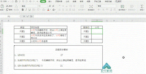 如下GIF,要求找出对应人员“小可”在一句话中出现的次数,这里我们用到了len字符长度函数和substitute文本替换函数来处理。