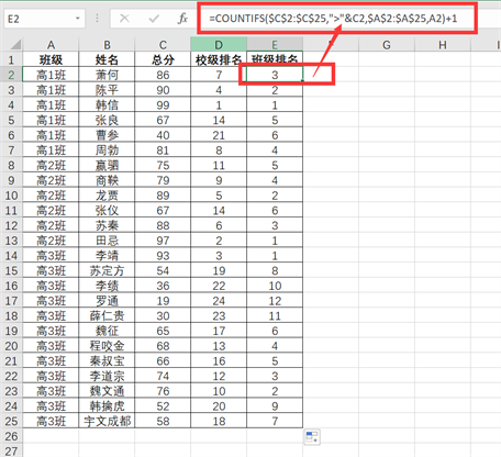1、在E2单元格中输入公式:=COUNTIFS($C$2:$C$25,”>”&C2,$A$2:$A$25,A2) 1,并向下填充。
