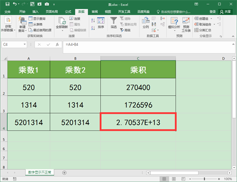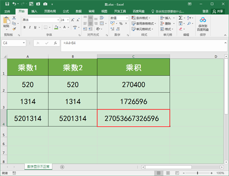 下图工作表C列中的乘积为同行A列和B列中数值相乘的结果。但是,在第四行中,由于“5201314”乘以“5201314”的结果数值太大、位数较多,导致C4单元格中的乘积显示不正常。这篇文章跟大家分享一下解决办法。