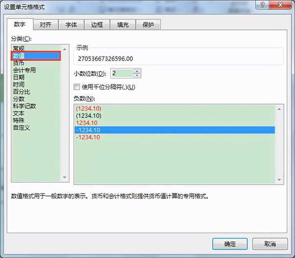 2. 在对话框左侧的“分类”列表中选择“数值”选项。