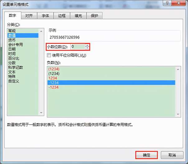 3.在对话框中设置数值要显示的“小数位数”,这里设为“0”,最后单击“确定”按钮。