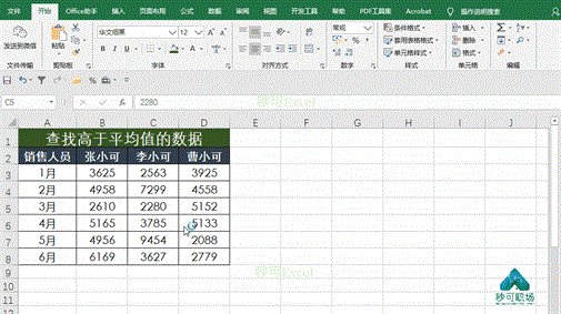 如下GIF,条件格式还可以实现一些用函数公式做起来很麻烦的事,比如查找高于平均值的业绩,用条件格式可以仅用一步轻松搞定。