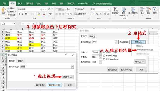 如上,查找框,Excel会查找,制定目标单元格样式,且内容含有李四的所有单元格。