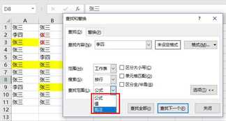 如下示例,查找含有李四的单元格,并选定所有单元格。